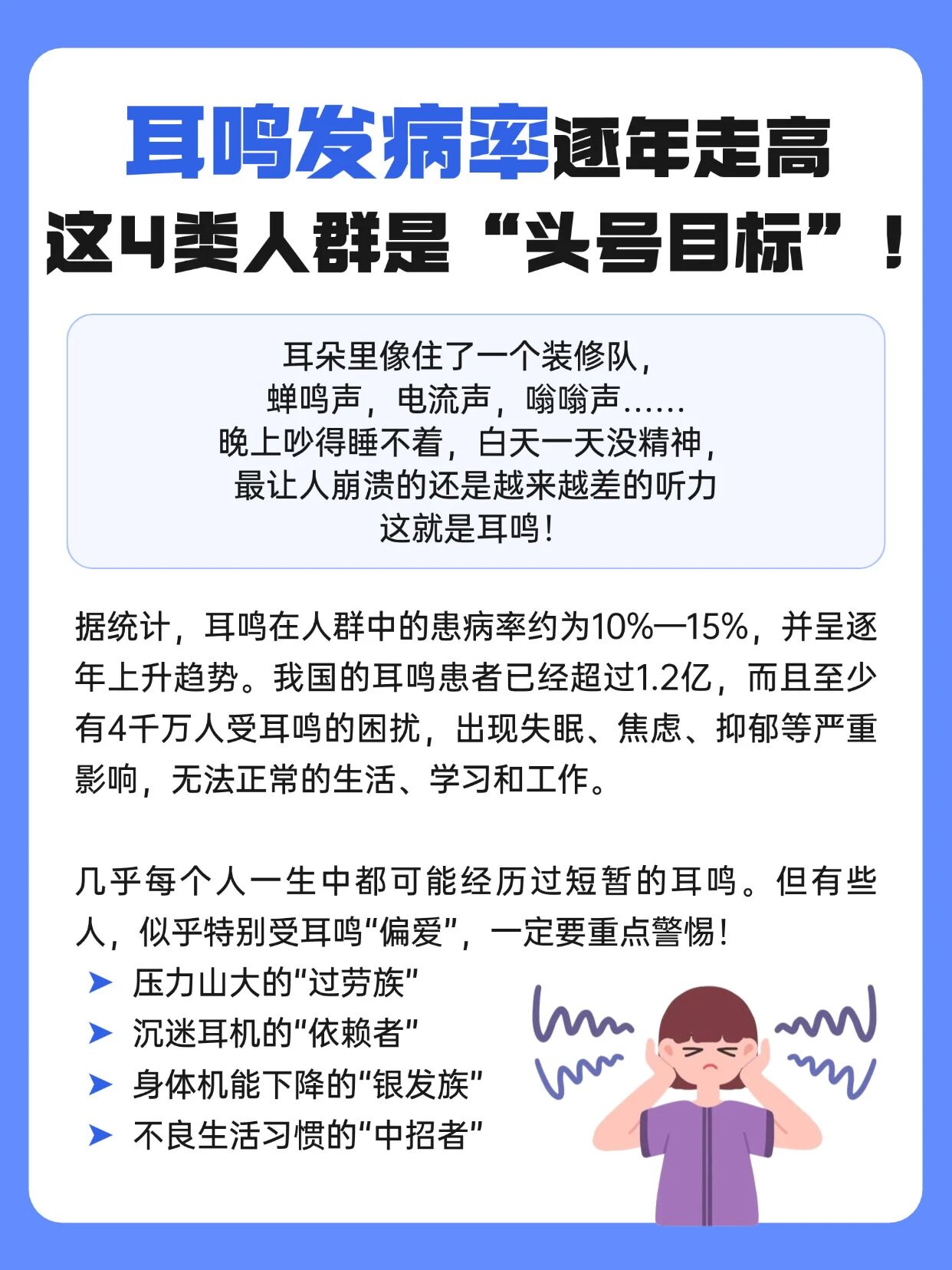 耳鸣在人群中的发生率高达15%-20%,也就是说,每5-6个人里,就有1人经历过耳鸣。但并不是所有人都会被耳鸣盯上,这几类人群,一定要重点警惕!