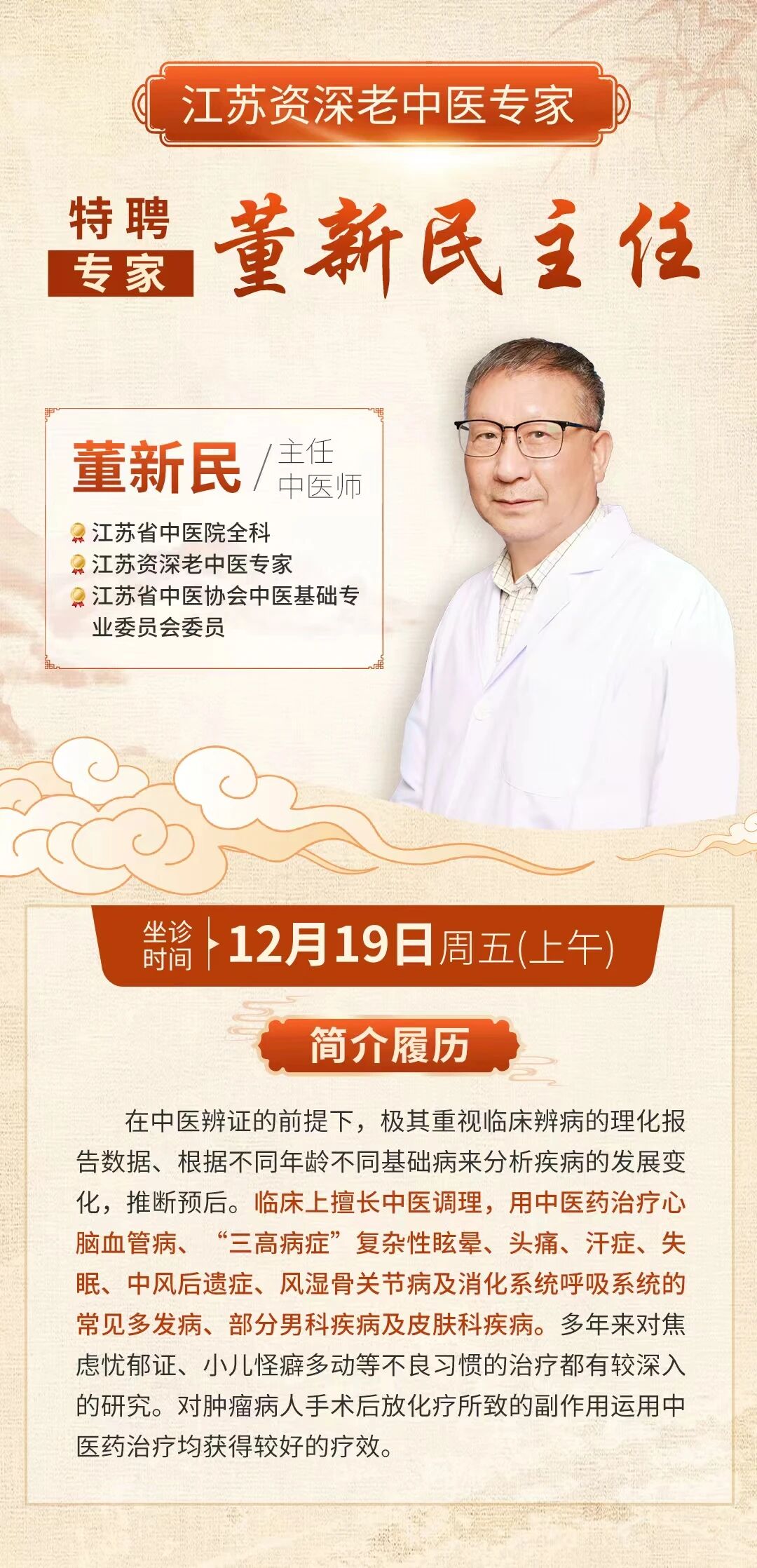 想更精准地稳住血压、健康过冬?机会来了!江苏省中医院资深名中医董新民主任将于本周五(19日)上午坐诊,为您一对一辨证施治,解答冬季血压、心脑血管等养生调理难题。名额有限,有需要的朋友请抓紧预约!